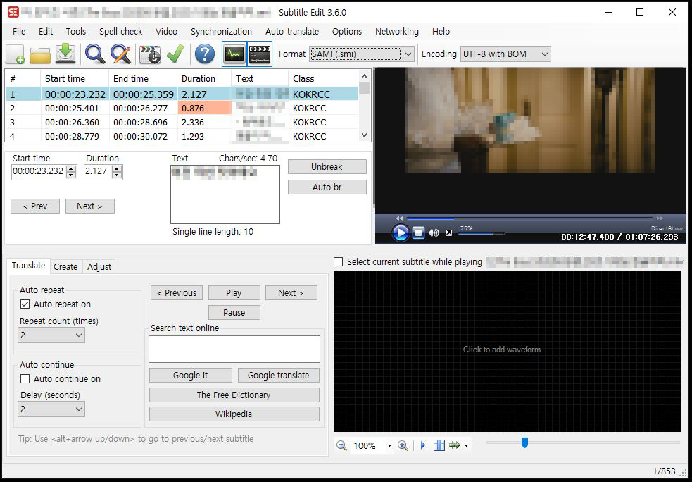 물론, 위의 'Subtitle Edit'라는 프로그램 으로도