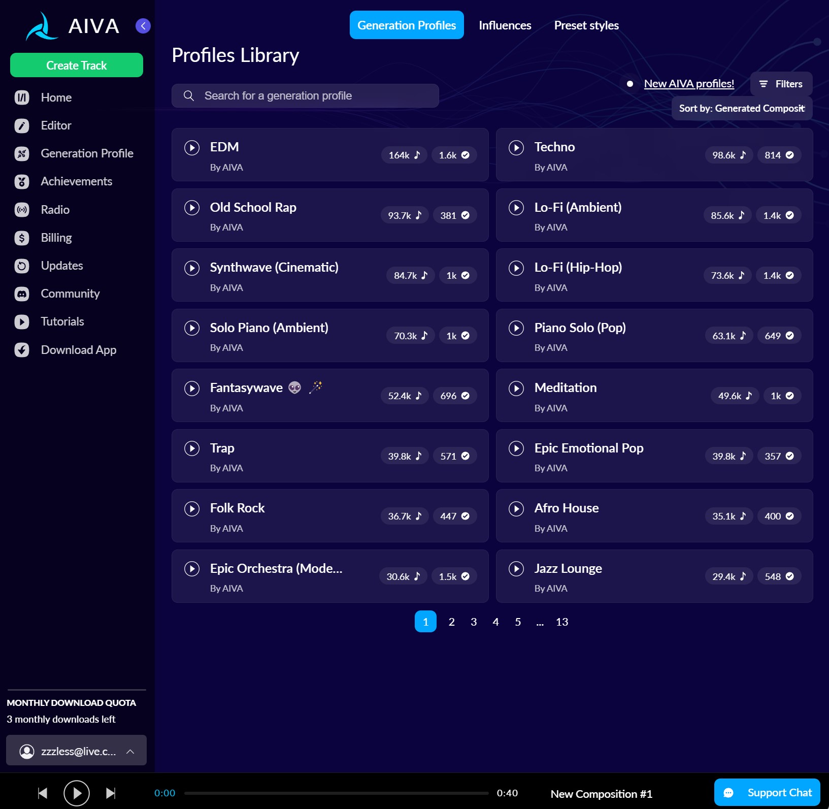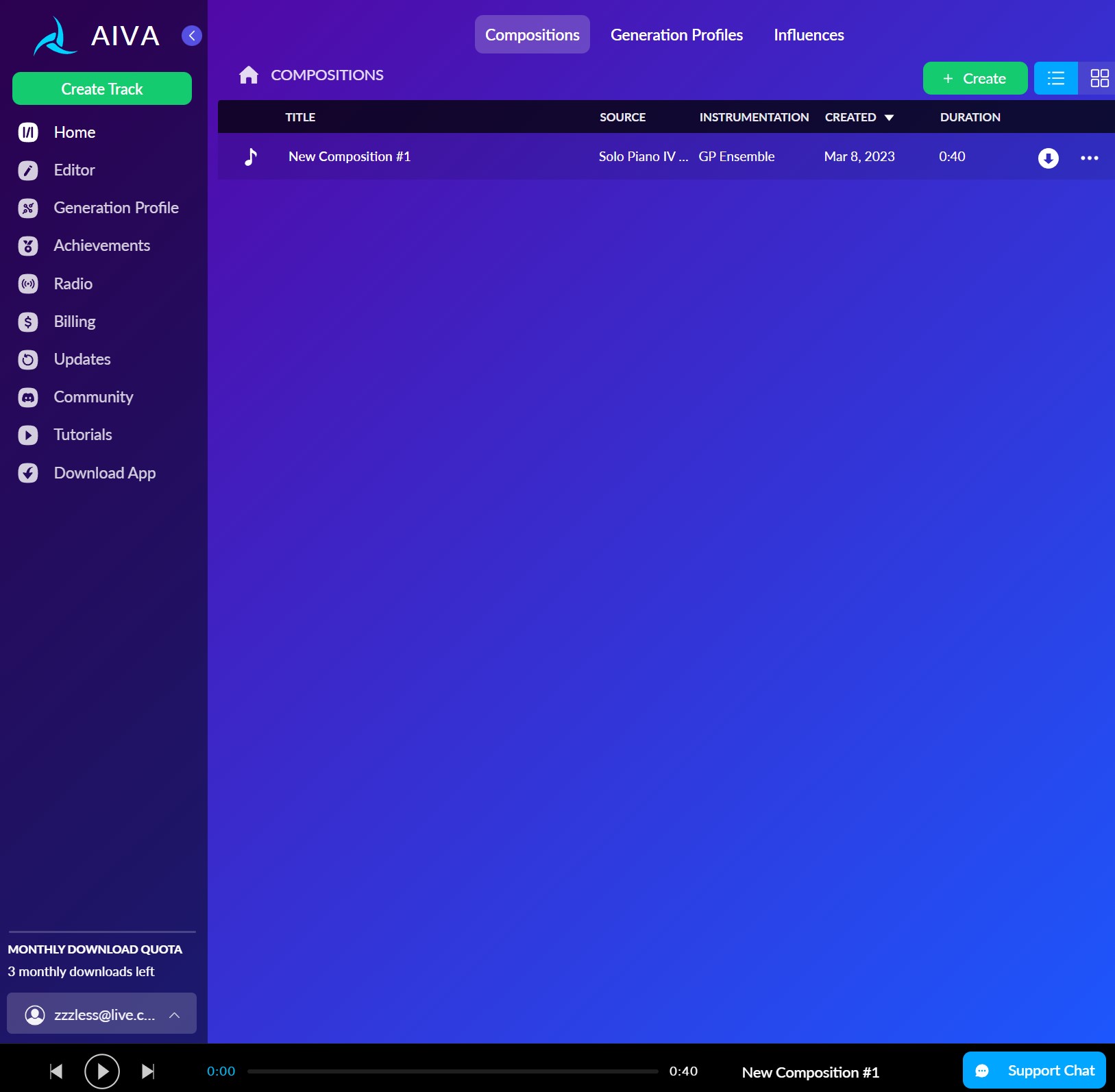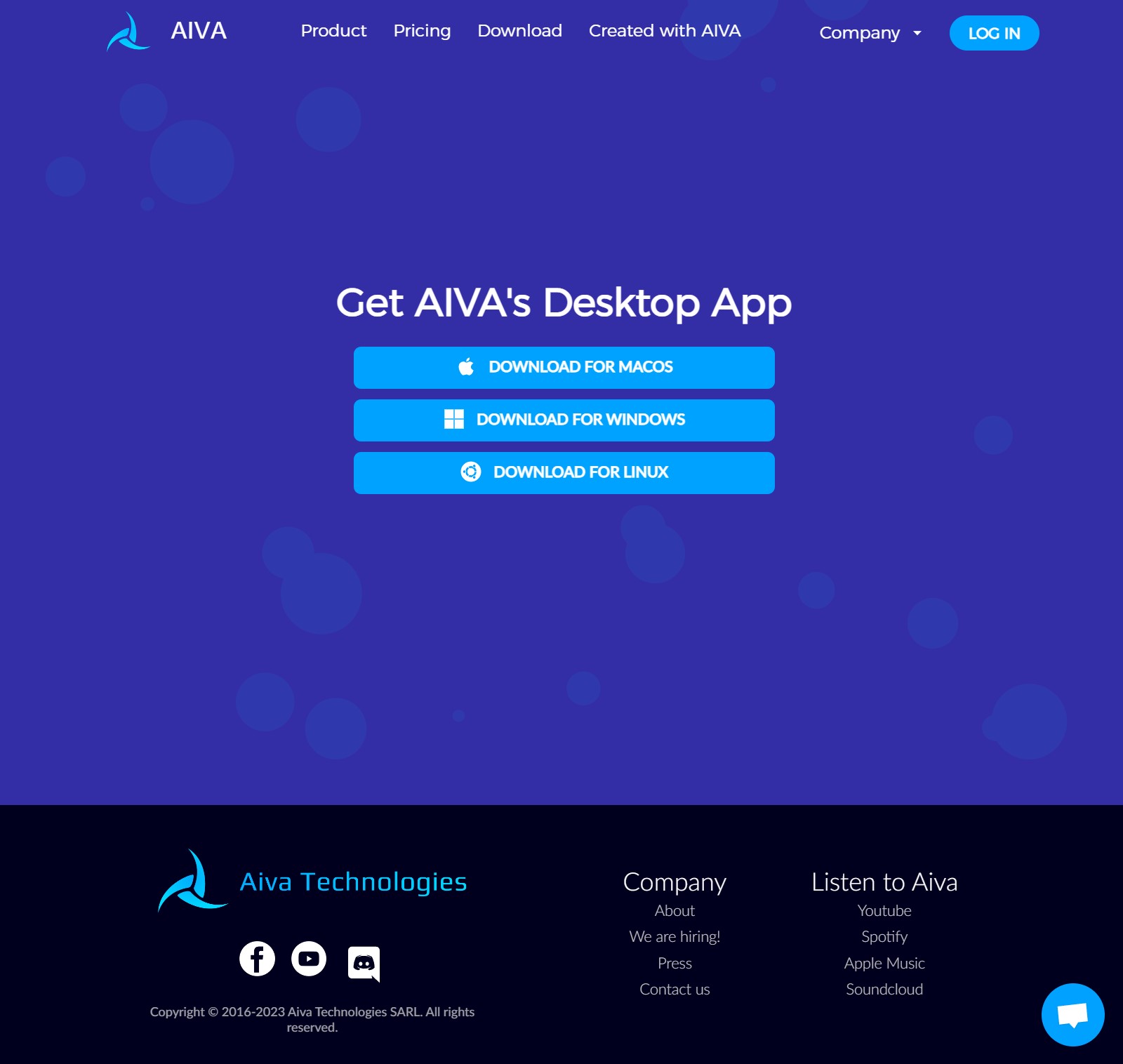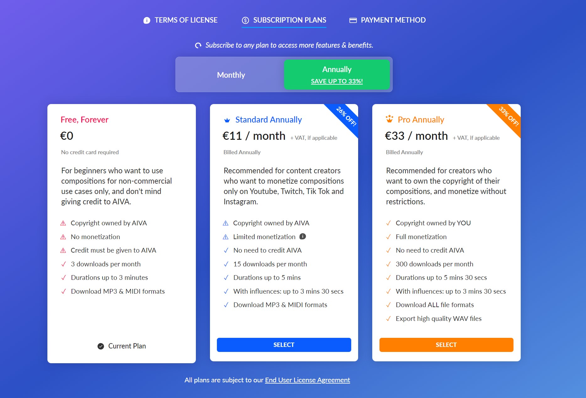 No licensing headache Like a track you just created with AIVA? Need to use it for your own commercial activity? No problem. By subscribing to our Pro Plan, you own the full copyright of any composition created with AIVA, forever. Learn more about licensing